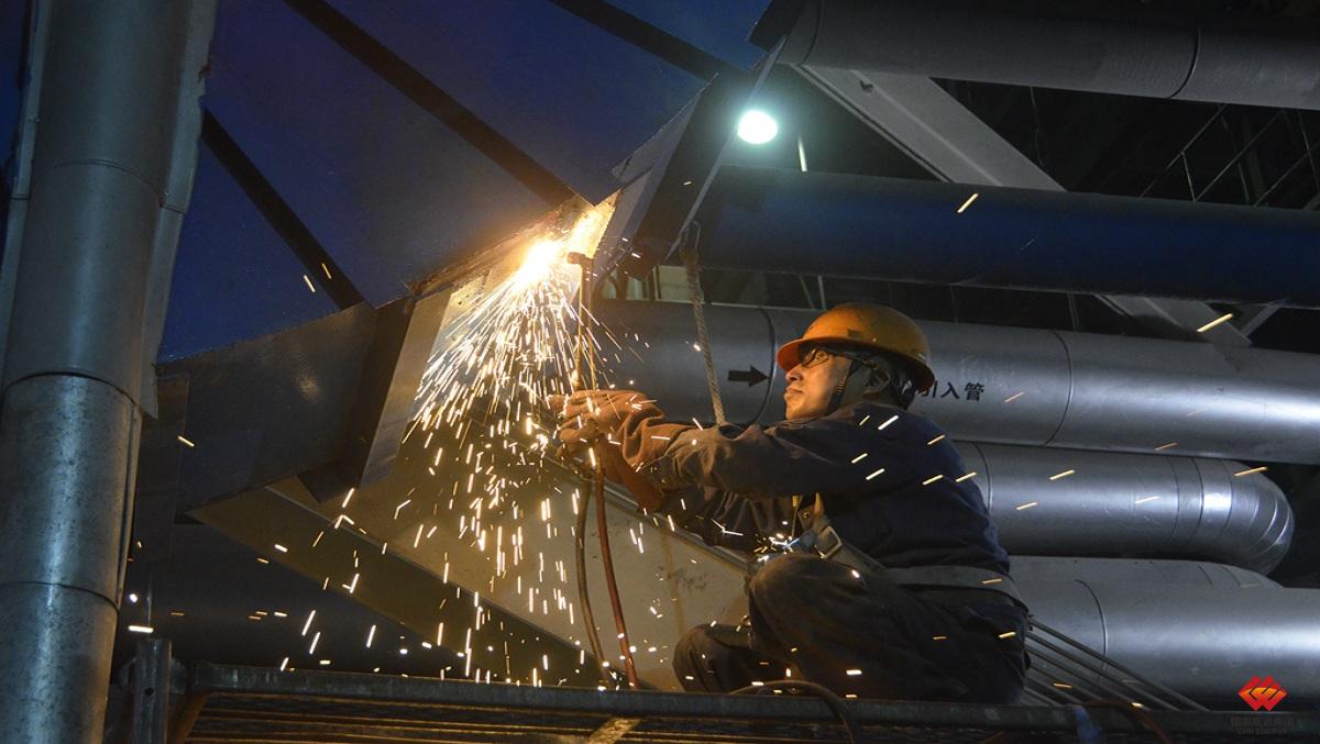 圖為該廠鍋爐焊工加緊進(jìn)行一次風(fēng)箱的恢復(fù)性焊接。