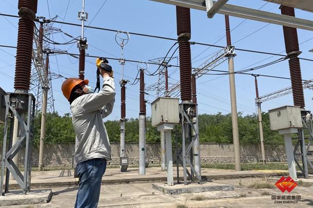?圖為高公司檢修人員用紅外測溫儀對升壓站進行測溫