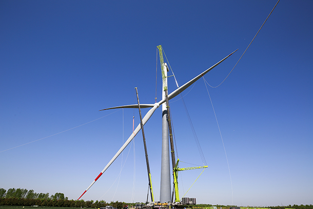 圖為河北公司定州50兆瓦風電項目風機正在吊裝