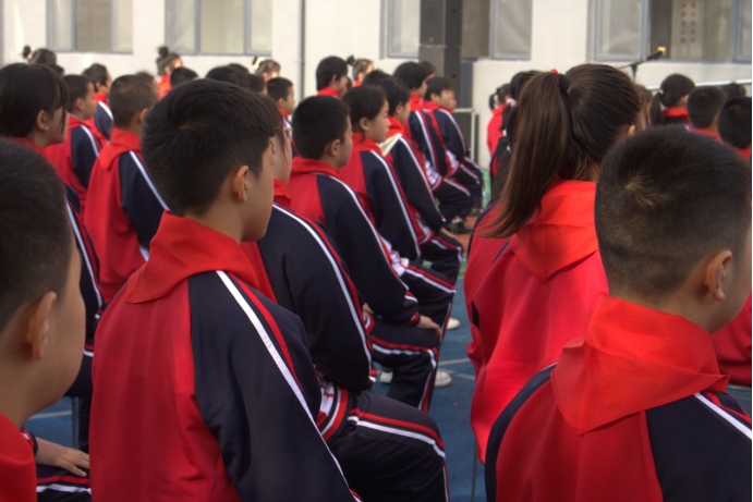 戴著紅領(lǐng)巾的小學生們坐在國家能源集團愛心學校的操場上 (朱澤雅 攝)