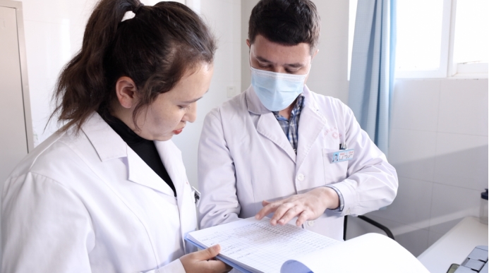 圖為阿布迪熱合曼·圖爾蓀(左)和同事一起討論查房情況