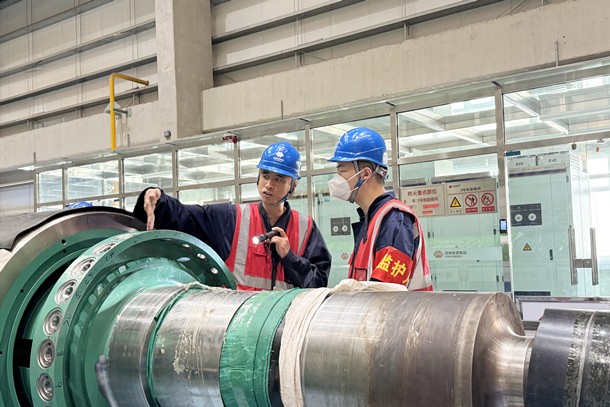 圖為機(jī)組檢修現(xiàn)場(chǎng)檢修人員認(rèn)真檢查汽輪機(jī)葉片