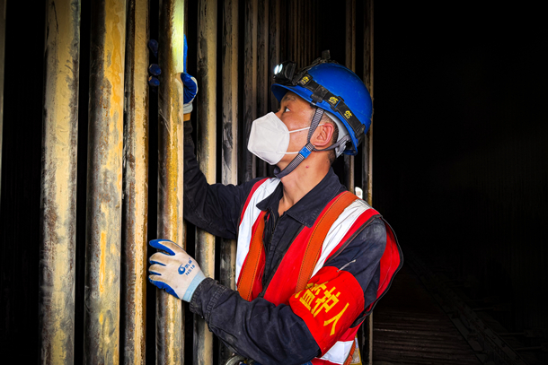 圖為黨員在爐膛內(nèi)部開展受熱面防磨防爆檢查