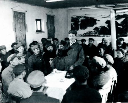 黨的十一大代表、全國煤炭戰(zhàn)線勞動英雄楊永成(站立者)在班前會上