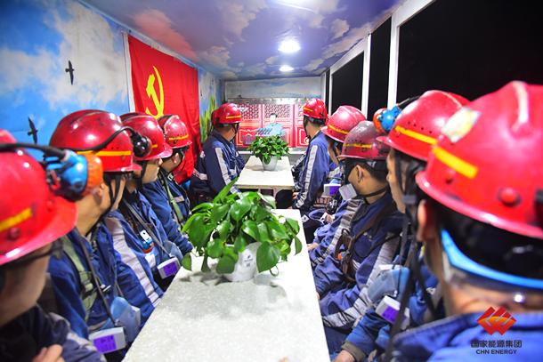 圖為神東大柳塔綜采五隊(duì)在井下收看慶祝中國(guó)共產(chǎn)黨成立100周年大會(huì)盛況