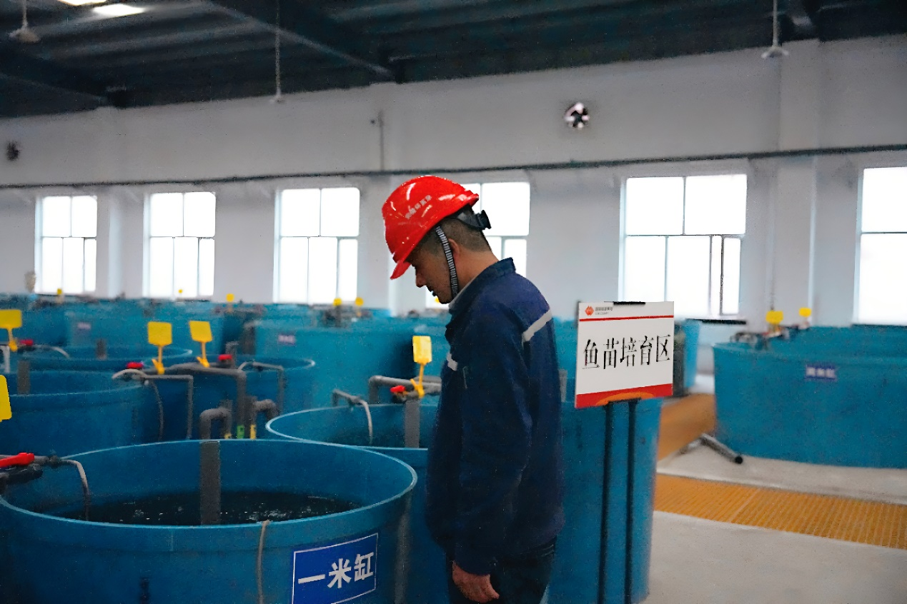 Staff at the Ma’erdang Hydropower Station’s fish breeding center checking the condition of the juvenile fish